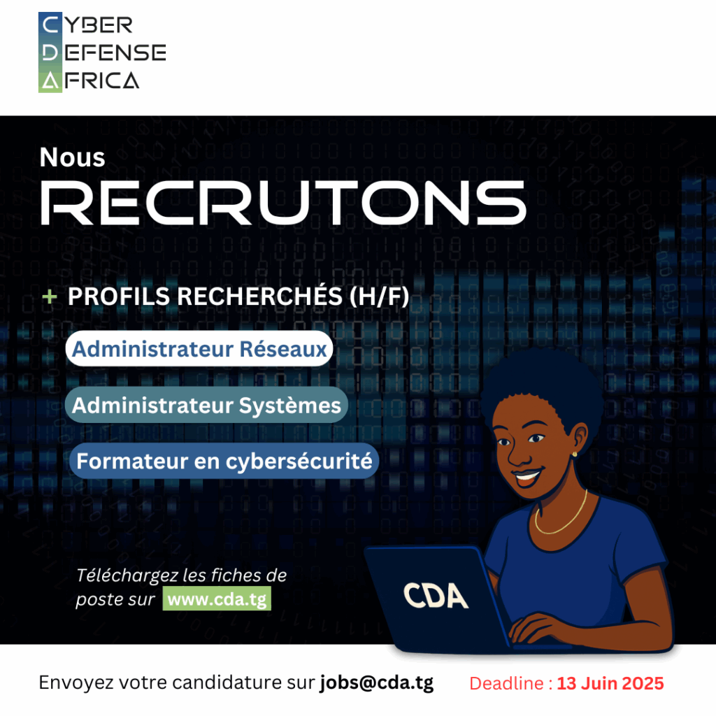 Dans le cadre de son développement, Cyber Defense Africa (CDA) lance un appel à candidatures pour pourvoir des postes techniques stratégiques dans les domaines des systèmes, des réseaux et de la formation en cybersécurité.